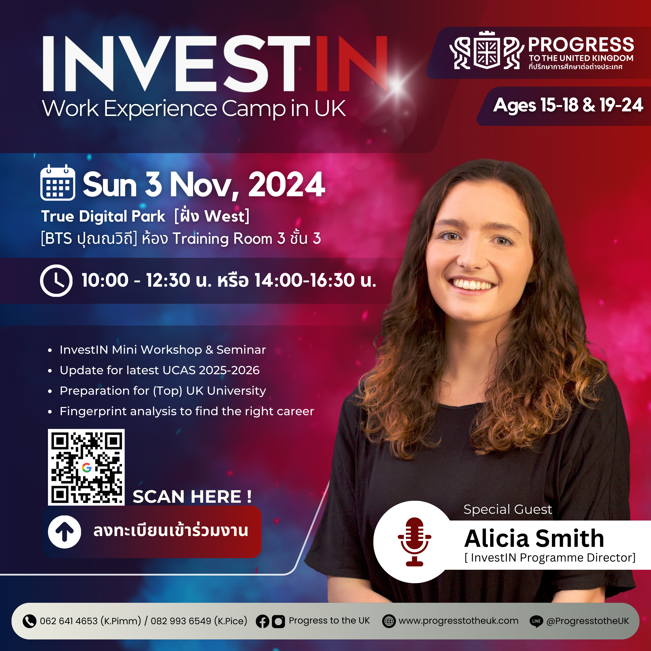 ทีม Progress to the UK ขอเรียนเชิญผู้ปกครองและน้องๆอายุ 15 -18 ปี และ 19 -24 ปี ร่วมพูดคุยและสอบถามข้อมูลรายละเอียดของ InvestIN Immersive Career Camp ช่วง July-August 2025 กับ Speaker คุณ Alicia Smith [InvestIN Programme Director] ที่จะมาพูดคุยเกี่ยวกับแคมป์มีโปรแกรมใดบ้างที่น่าสนใจ รวมถึงจัด Mini Workshop สำหรับทุกท่านที่เข้าร่วมงาน