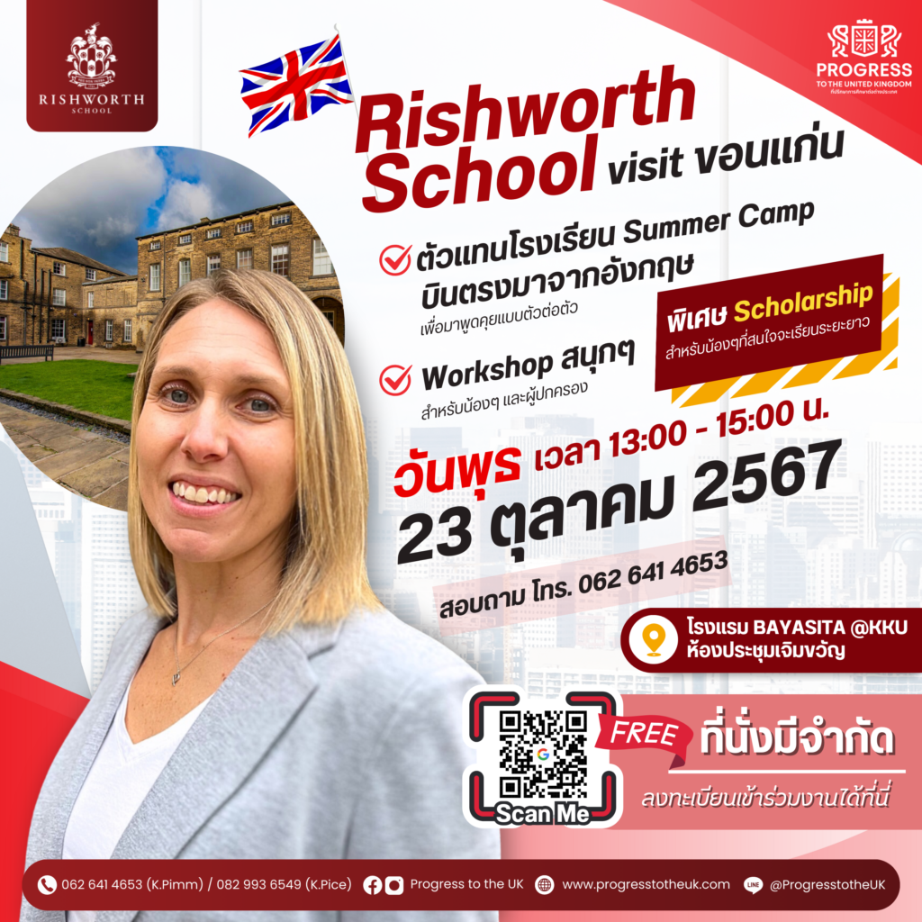 ร่วมพูดคุยและพบกับคุณ Rebecca Miller – Head of Admissions จากโรงเรียน Rishworth โรงเรียนประจำจากประเทศอังกฤษ โรงเรียน Rishworth เป็นโรงเรียนประจำในอังกฤษเก่าแก่ที่ก่อตั้งปี คศ. 1724 บนพื้นที่กว่า 130 เอเคอร์ ล้อมรอบด้วยบรรยากาศที่สงบ และปลอดภัย ปัจจุบันดำเนินการเรียนการสอนมากว่า 300 ปี โรงเรียนเป็นโรงเรียนเอกชนประจำประเภทสหศึกษาที่มีขนาดกลางด้วยจำนวนนักเรียนกว่า 500 คน โดยมีสัดส่วนของนักเรียนอังกฤษและนักเรียนต่างชาติอยู่ที่ 80:20 ทำให้เพิ่มโอกาสให้นักเรียนต่างชาติได้เรียนรู้ภาษา และวัฒนธรรมอังกฤษได้อย่างรวดเร็ว ทั้งนี้โรงเรียน Rishworth ยังเด่นในด้านของกีฬา โดยเฉพาะกีฬาแบดมินตัน และกีฬาฟุตบอลโดยโรงเรียนเป็นพันธมิตรกับสมาคม Badminton England และ สโมสร Manchester City