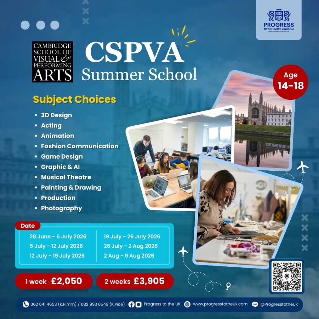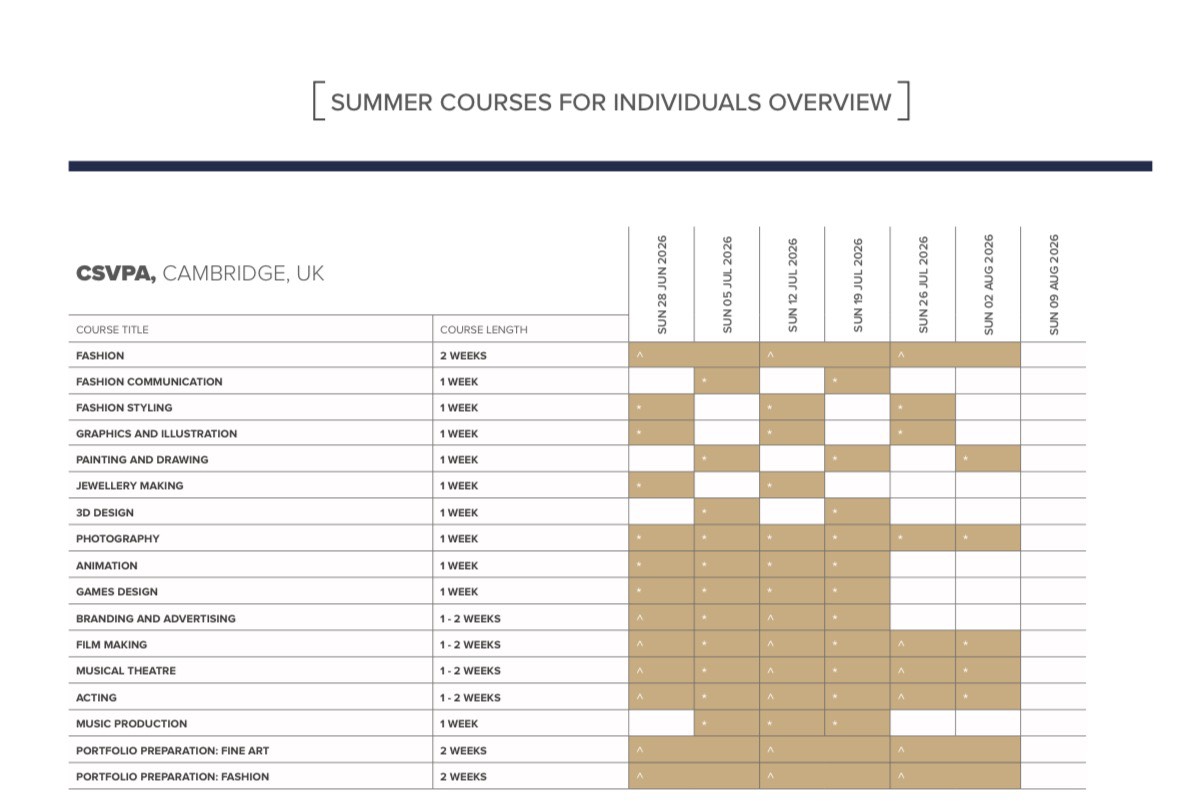 หลักสูตร: Creative courses: 3D Design, Acting, Animation, Fashion, Fashion Communication, Fashion make up, Fashion Styling, Film Making, Game Design, Graphic & Illustration, Painting & Drawing, Photography, Portfolio Preparation, Music Production, Music Theatre